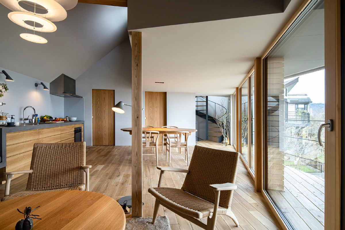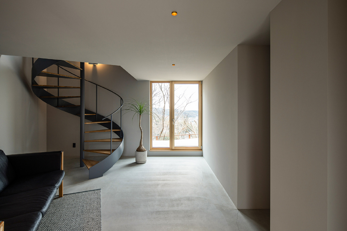 1階のエントランスから螺旋階段を登るとたどり着くのは、窓越しに広がる一面の豊かな眺望。