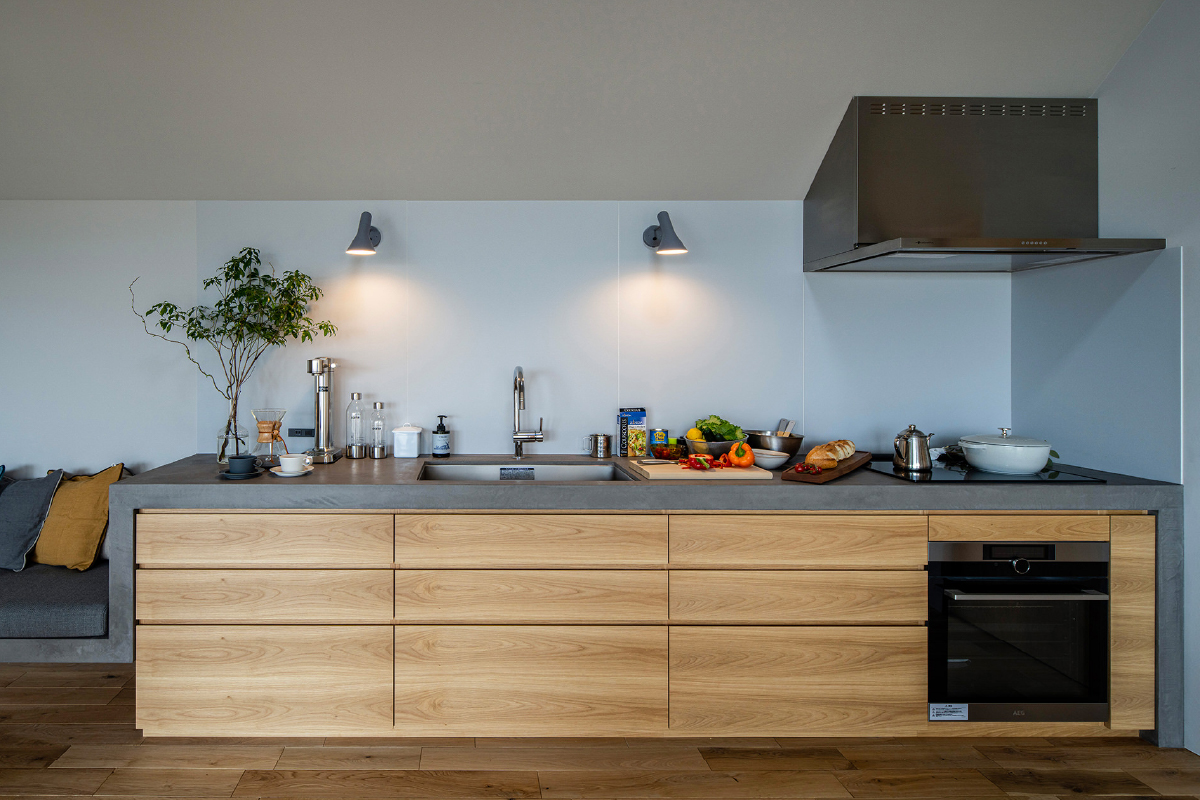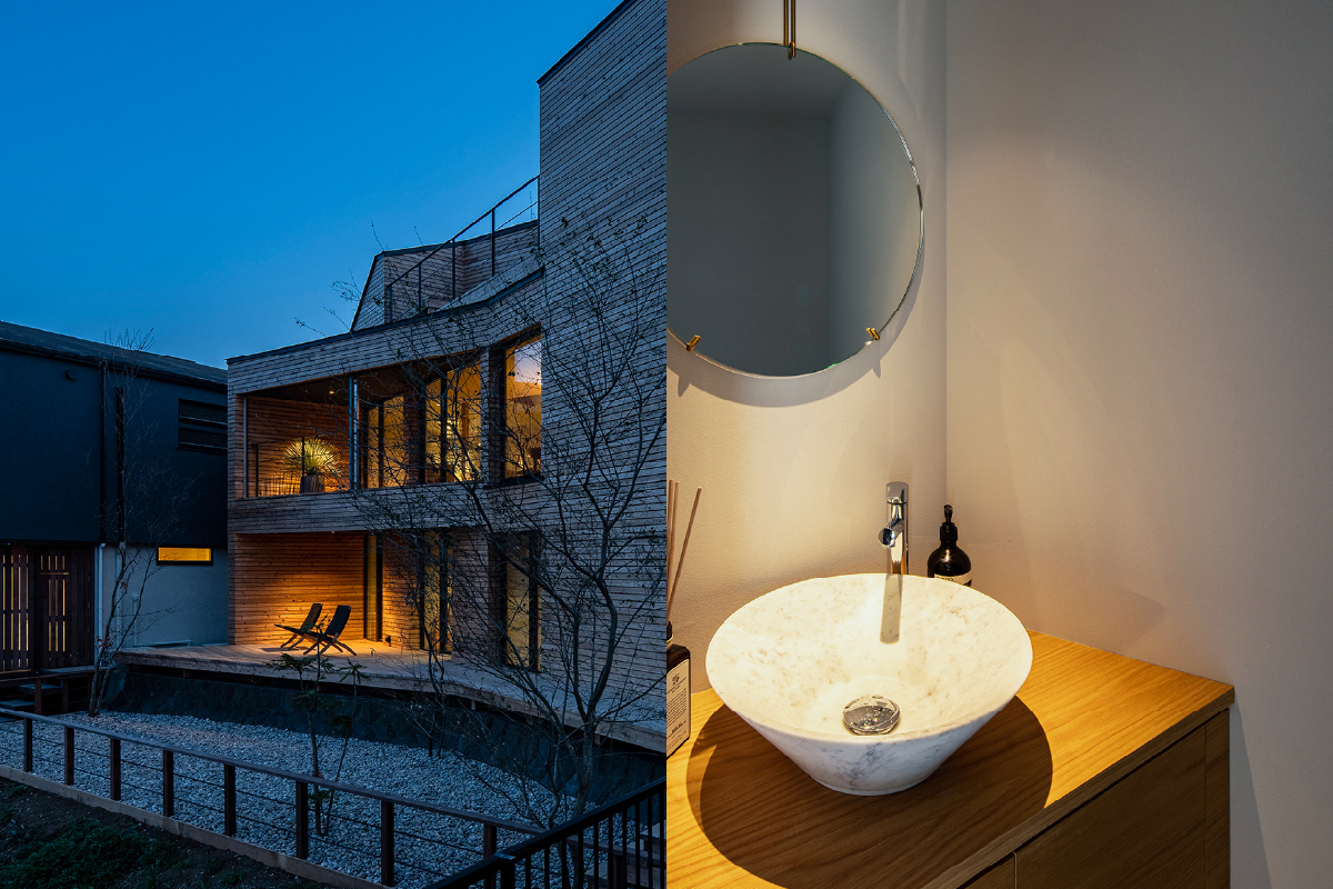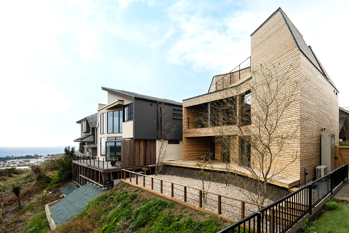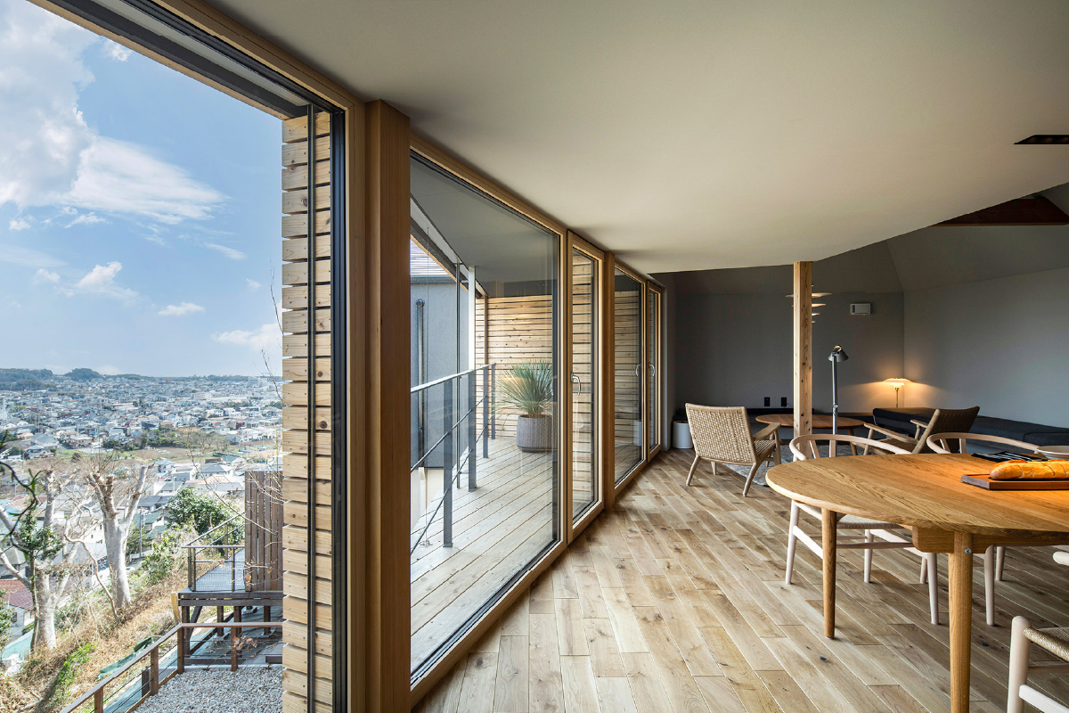 自然と調和した木のファサードが特徴。建築家・菊池佳晴が設計したこの魅力的な住まいは、一面に広がる素晴らしい眺望が楽しめるリビングダイニングで家族が集まり、贅沢な時間を過ごすことができます。