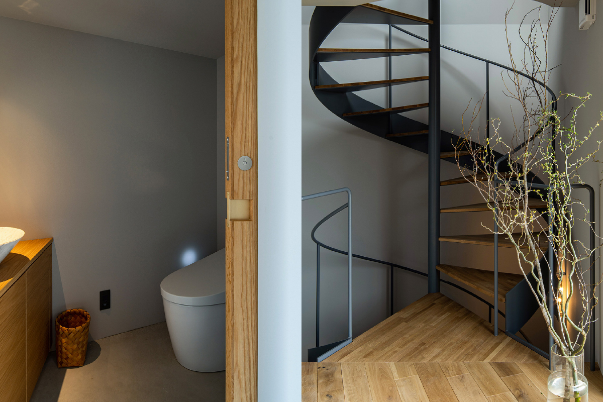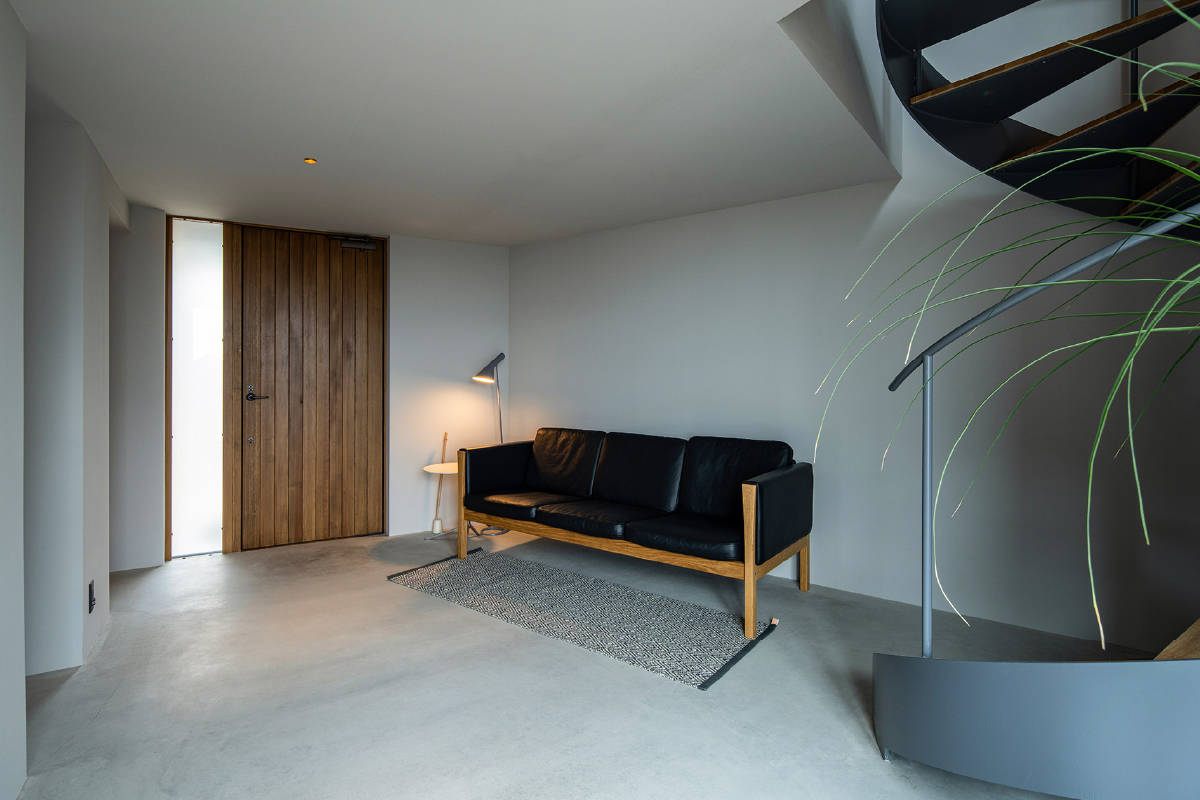 サーフードや自転車などのアウトドアグッズをそのまま置ける広いエントランスには、上階へと伸びる螺旋階段を配置。