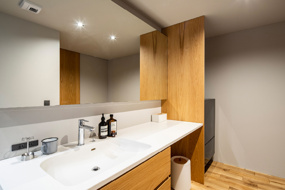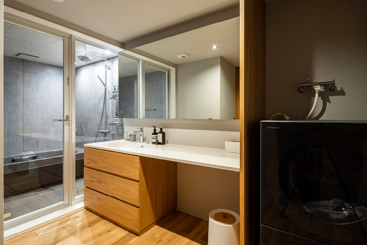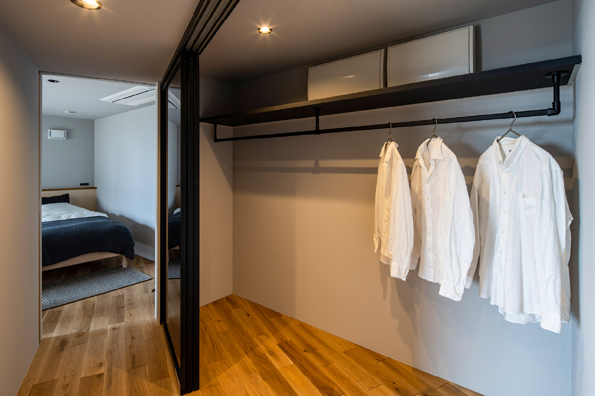 一箇所にまとめることで各部屋のスペースに余裕が生まれることに加え、家事導線を短縮でき、リビングや個室に衣類などが散らばらないのも魅力の一つです。そして毎日使う空間だからこそ、気分が上がるようなデザイン性をプラス。ブラックガラスの奥に並ぶ衣類は洒落感のある照明で照らされ、ブティックのような雰囲気の中で衣類選びの時間を楽しむことができます。