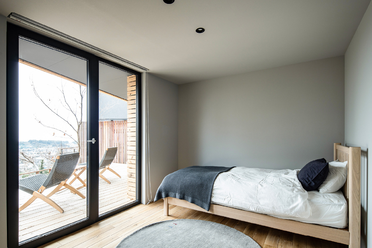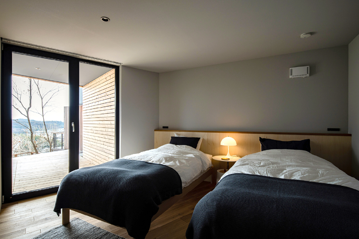 落ち着きあるプライベート空間それぞれの個室はテラスヘとアクセスが可能。収納をなくし、廊下のファミリークローゼットに機能をまとめることで、ベッドを主役にしたすっきりとしたホテルの客室のような空間に仕上げています。
