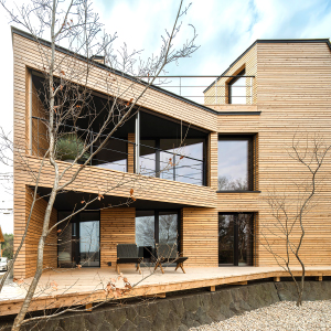 自然と調和した木のファサードが特徴。建築家・菊池佳晴が設計したこの魅力的な住まいは、一面に広がる素晴らしい眺望が楽しめるリビングダイニングで家族が集まり、贅沢な時間を過ごすことができます。